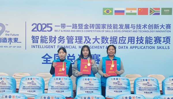 本网讯(会计学院 陈嘉煊)为积极响应新时代对高素质经管人才的需求,深化产教融合与数智化人才培养模式创新,11月29日至30日,在智能会计产业学院的支持下,会计学院李婉盈、陈嘉煊、田玉茜三位同学组成的参赛团队,远赴安徽合肥参加2025一带一路暨金砖国家技能发展与技术创新大赛之智能财务管理及大数据应用技能赛项全国总决赛,三名参赛选手凭借扎实的专业功底与出色的现场发挥,在全国总决赛中荣获三等奖铜牌及获奖证书,展现了会计学院在智能财务与大数据应用领域人才培养的显著成效。