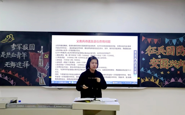 对于出现人际交往不适应、情感问题等诸多因素导致心理问题的学生,她做到定期谈话和班级对接帮扶。加强学生日常宿舍管理,促进良好学风的形成,深入学生公寓,了解学生的思想状况,解决实际问题。在宿舍的不断走访中建立了连队内学习标杆宿舍、卫生标杆宿舍,寝室文化内涵有了进一步的提升,寝室环境得到了进一步的改善。