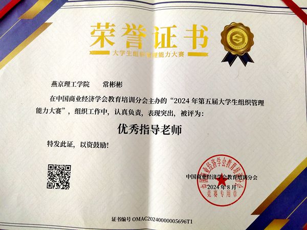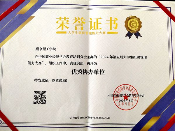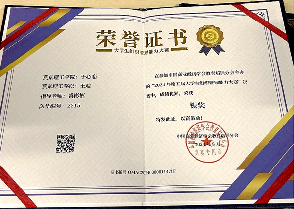 近日,由中国商业经济学会教育培训分会主办的第五届全国大学生组织管理能力大赛圆满落幕,燕京理工学院被评为“2024年第五届大学生组织管理能力大赛优秀协办单位”,国际商学院学生荣获一枚银牌、六枚铜牌和两个优秀奖,常彬彬老师荣获“优秀指导老师”证书,2名同学获“2024年第五届大学生组织管理能力大赛”银奖,11名同学获得铜奖,5名同学获得优秀奖。