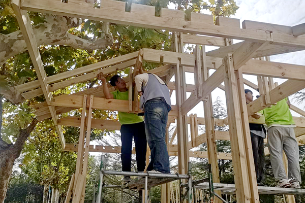 在搭建活动中,燕理学子与来自山东省内多所高校的80余名同学进行了合作与交流。在为期三天的活动中,学生们在烟台大学郑彬教授和烟台蓝居建筑设计咨询有限公司总经理董经理的指导下,进行了深入的建造搭建技能训练。郑彬教授以其丰富的教学经验和深厚的专业知识,为学生们提供了宝贵的理论指导和实践建议。董总经理则以其在建筑设计领域的实践经验,为学生们带来了行业前沿的设计理念和技术分享。