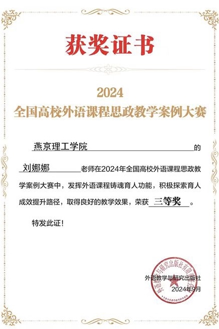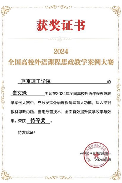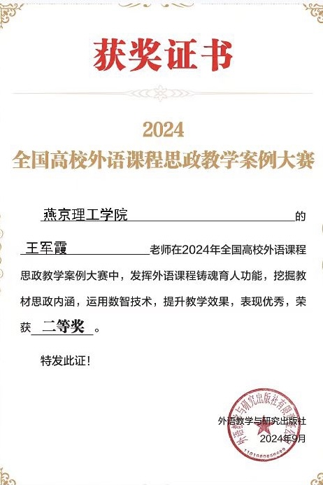 为全面推进高校外语课程思政高质量建设,促进高校外语教师以习近平新时代中国特色社会主义思想铸魂育人,落实立德树人根本任务,外语教学与研究出版社于2024年5月启动全国高校外语课程思政教学案例大赛。参赛教师利用暑期反复钻研教材、深挖思政元素、撰写打磨思政教学单元设计方案,全力备赛。最终经过评委会评审,斩获多个奖项。