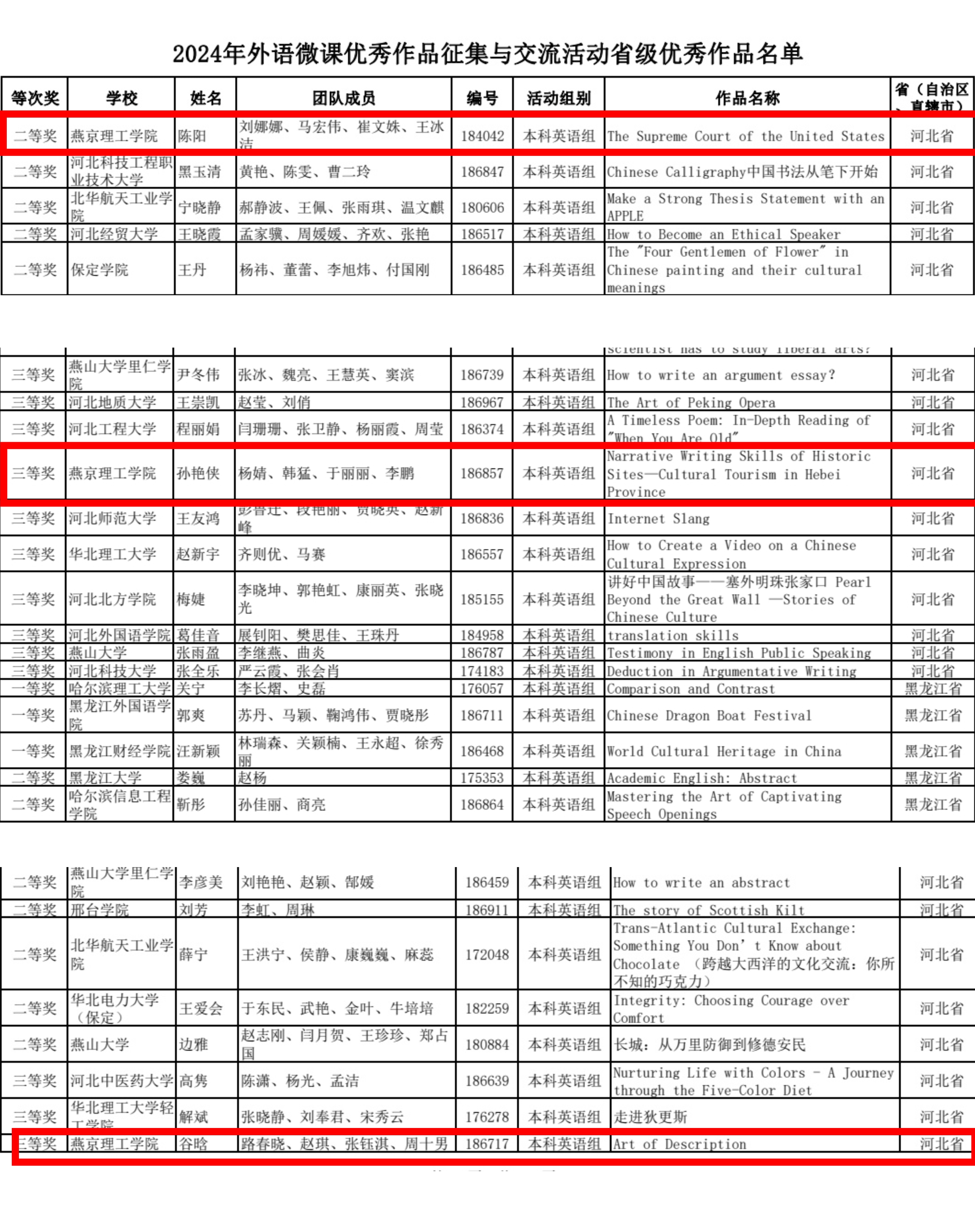 本网讯(人文教育学院 王军霞)近日,第十届河北省高等学校外语微课大赛落下帷幕。经过大赛举办方层层评选,人文教育学院陈阳教师团队作品《The supreme court of the united states》在众多优秀作品中脱颖而出,获得河北省本科英语组二等奖。谷晗教师团队、孙艳侠教师团队获得三等奖。