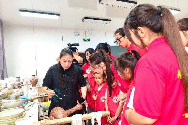 一张方桌、一团金丝、一张底板,一双巧手、一段时光、一个作品……在珑珐琅景泰蓝展览,实践团引领小朋友们了解珑珐琅的历史渊源与精湛的制作技艺,馆内藏品琳琅满目,精致典雅,令小朋友们赞叹不已,纷纷在展柜前流连忘返。来到制作现场,小朋友们实地观赏了珑珐琅景泰蓝的诞生过程,在工匠们几番娴熟的操作下,柔软的金丝被“掐”出各样的花纹轮廓,配以天然的矿物质釉料填充在花纹内,使得掐丝珐琅明润饱满。小朋友们在丝丝点点中感受到掐丝珐琅工艺之精湛,见证传统掐丝珐琅工艺独特之魅力。了解、学习、传承珑珐琅景泰蓝这项非遗传统技艺,要从年轻一代开始培养代代相传的“守艺人”。