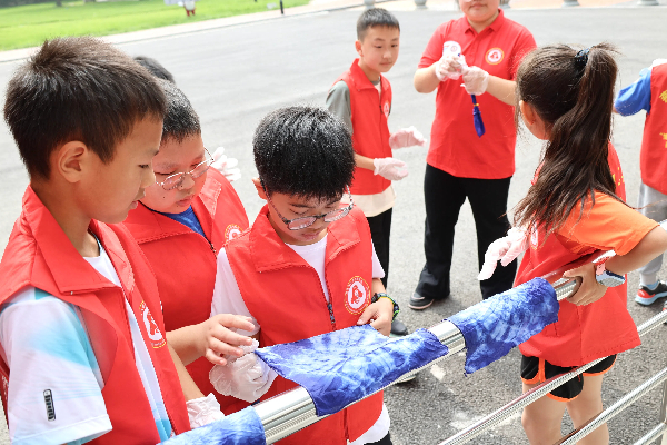 特色非遗扎染课程在燕理展开,从选布开始,一步步地扎花、泡水、浸染、清洗、晾晒,实践团成员帮助小朋友们创造了一件件独一无二的扎染作品。“老师您看,我做的扎染好像一只蓝色的精灵在云中飞呢!”小朋友们争先恐后地向实践团成员展示自己的扎染作品,一幅扎染、一个故事、一段讲述,孩子们纯真的笑脸,是对非遗文化满满的喜爱与向往,扎染不仅是中国优秀的传统技艺,其中蕴含的精神文化更在孩子们心中埋下了传承的种子。