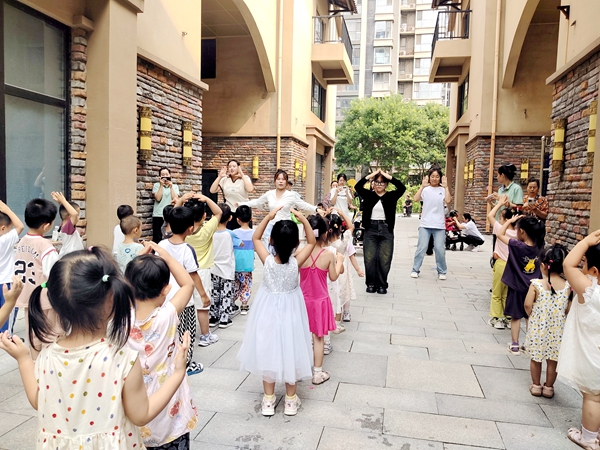 “红星闪闪放光彩,红星灿灿暖胸怀”伴随着脍炙人口的旋律,实践团成员与信合社区的小朋友们用手势舞筑起红色梦,用舞蹈演绎经典红色革命故事。除《红星闪闪》外,手势舞《祖国祖国我们爱您》,也向孩子们展现了团结乐观、勇敢坚定的红色革命精神。志愿者对舞蹈动作细致讲解,孩子们认真的脸庞、稚嫩的动作,动人的歌曲旋律在空气中飘荡,每一个节拍都承载着他们对祖国的热爱、对未来的希望。