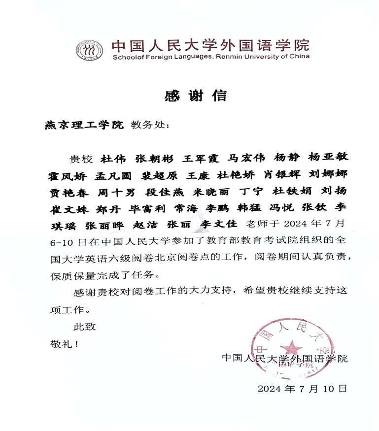 本网讯(教务处 杜伟)2024年7月6日至10日,应中国人民大学外国语学院(全国大学英语四、六级考试北京阅卷点)邀请,经学校批准,刘娜娜、杜伟、李鹏、王军霞、韩猛、张朝彬等30余位英语骨干教师代表学校参加了为期5天的全国大学英语四六级阅卷工作。其中,杜伟、刘娜娜、李鹏分别担任六级写作和六级翻译阅卷小组组长。