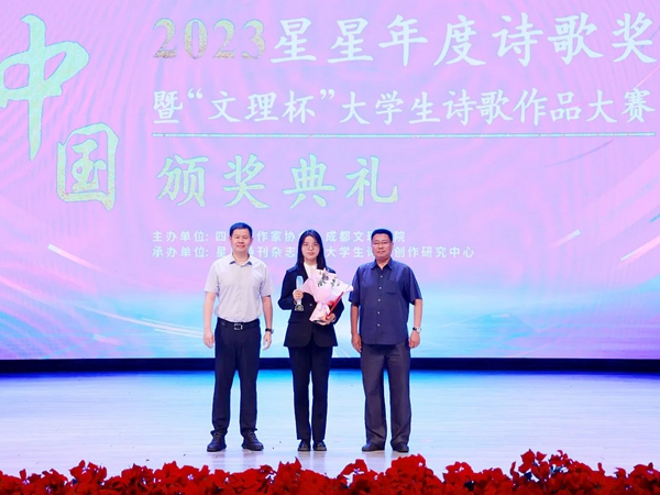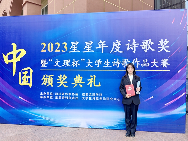 本网讯(人文教育学院 教务处 邸少华 杨杨)近日,2023·星星年度诗歌奖暨第三届“文理杯”大学生诗歌作品大赛颁奖典礼在成都文理学院星空剧场举行,我校人文教育学院汉语言文学专业2023级学生蔡佳茵凭借其新诗《爷爷的黄土》荣获特等奖。