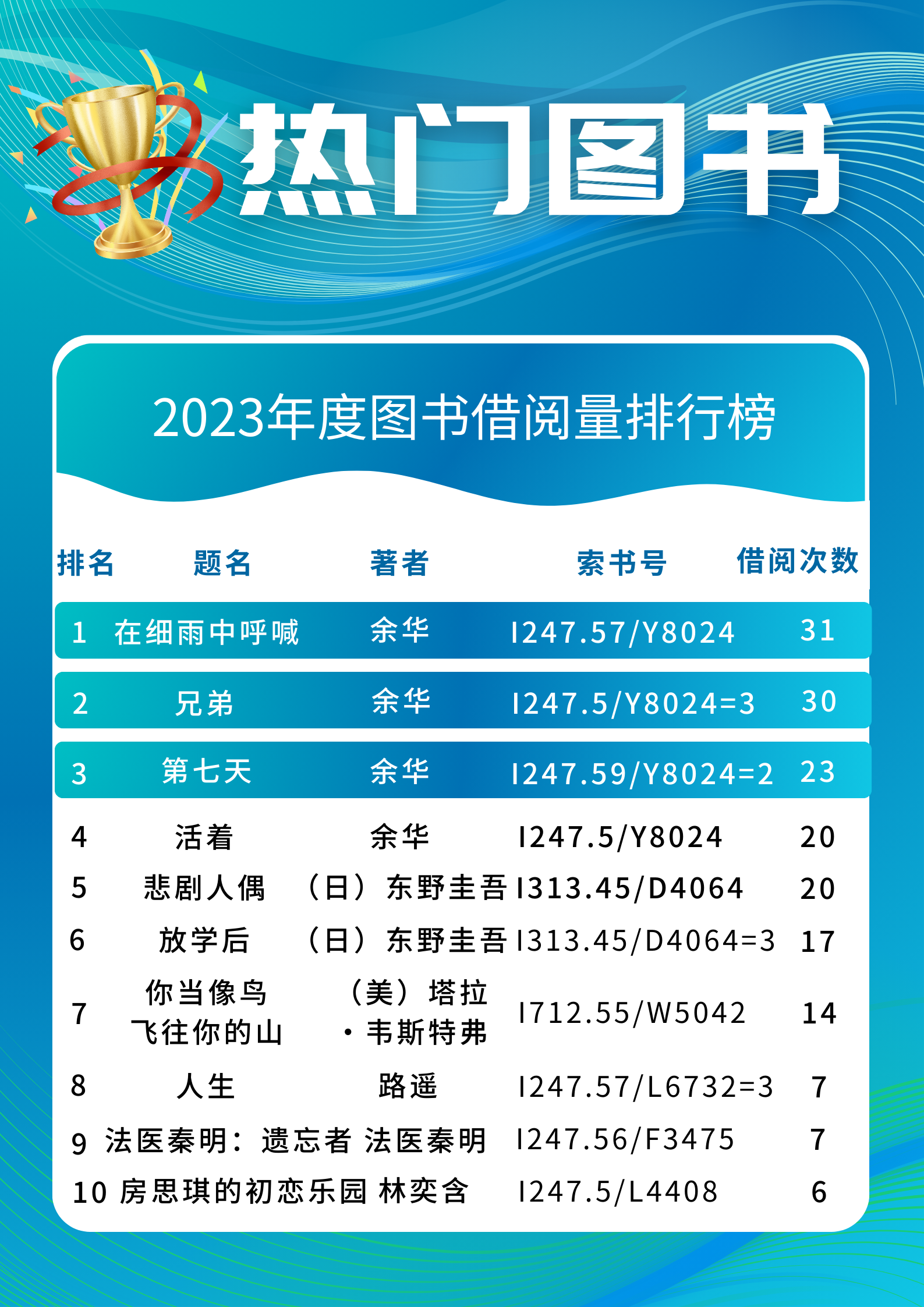 本网讯(图文信息中心 赵雪梅)自2024年起,燕京理工学院图书馆将持续进行校内读者阅读调查,通过图书图书管理系统对师生读者在馆内的借阅情况进行统计,设立年度读者借阅量排行榜、年度文献借阅量排行榜、年度最受欢迎作者排行榜,并在当年的阅读文化节期间进行数据发布。本次数据统计时段为2023年1月1日至2023年12月31日,统计对象为2023年全体在校师生。