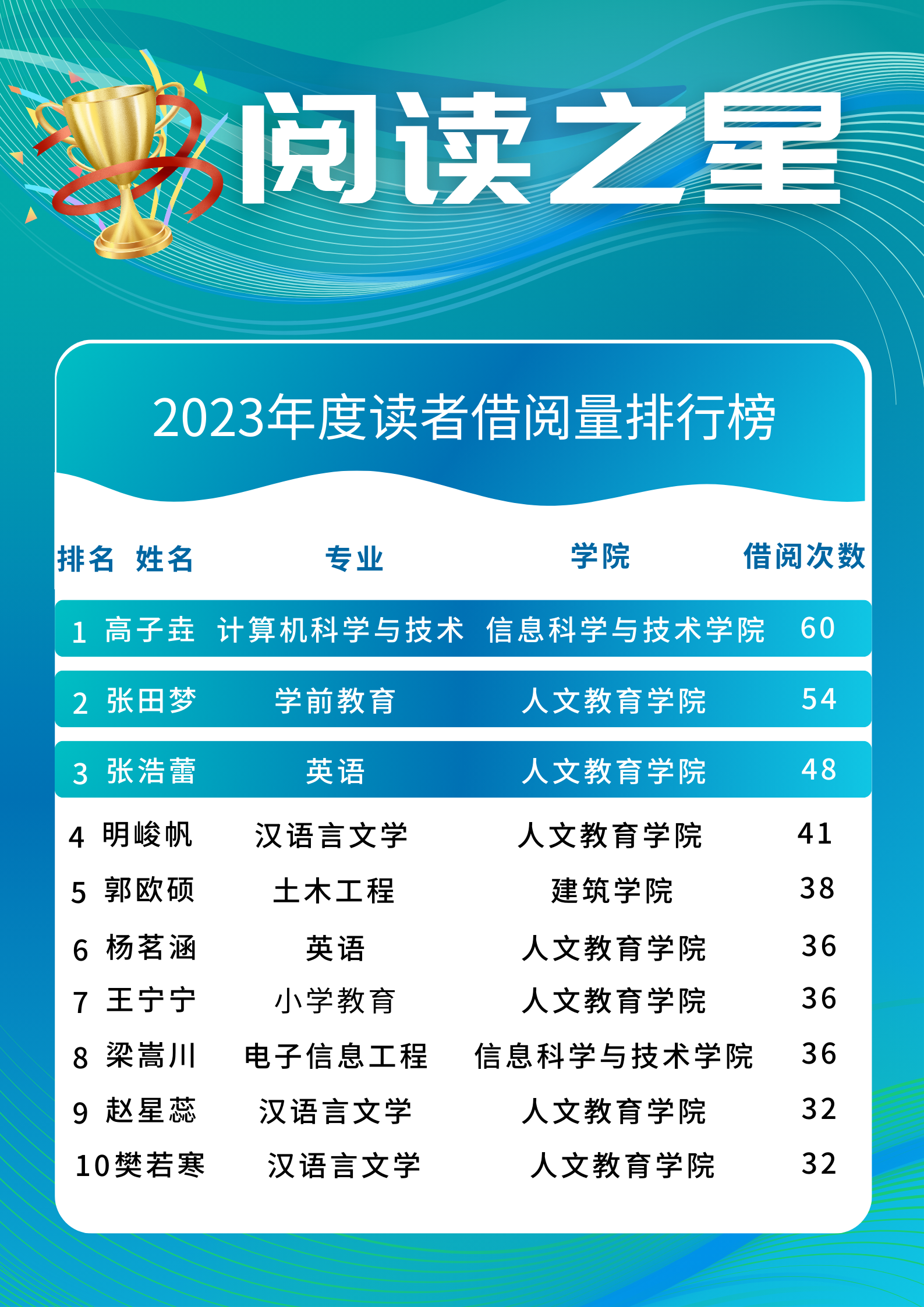 2023年,有10位学生读者的借阅量达到了30次以上,他们来自信息科学与技术学院、人文教育学院、建筑学院等多个二级学院,最高的借阅量高达60次/年,最低的也有32次/年。这些同学在课业学习之余,积极通过阅读丰富和提升自我,为全校读者树立了良好的榜样。