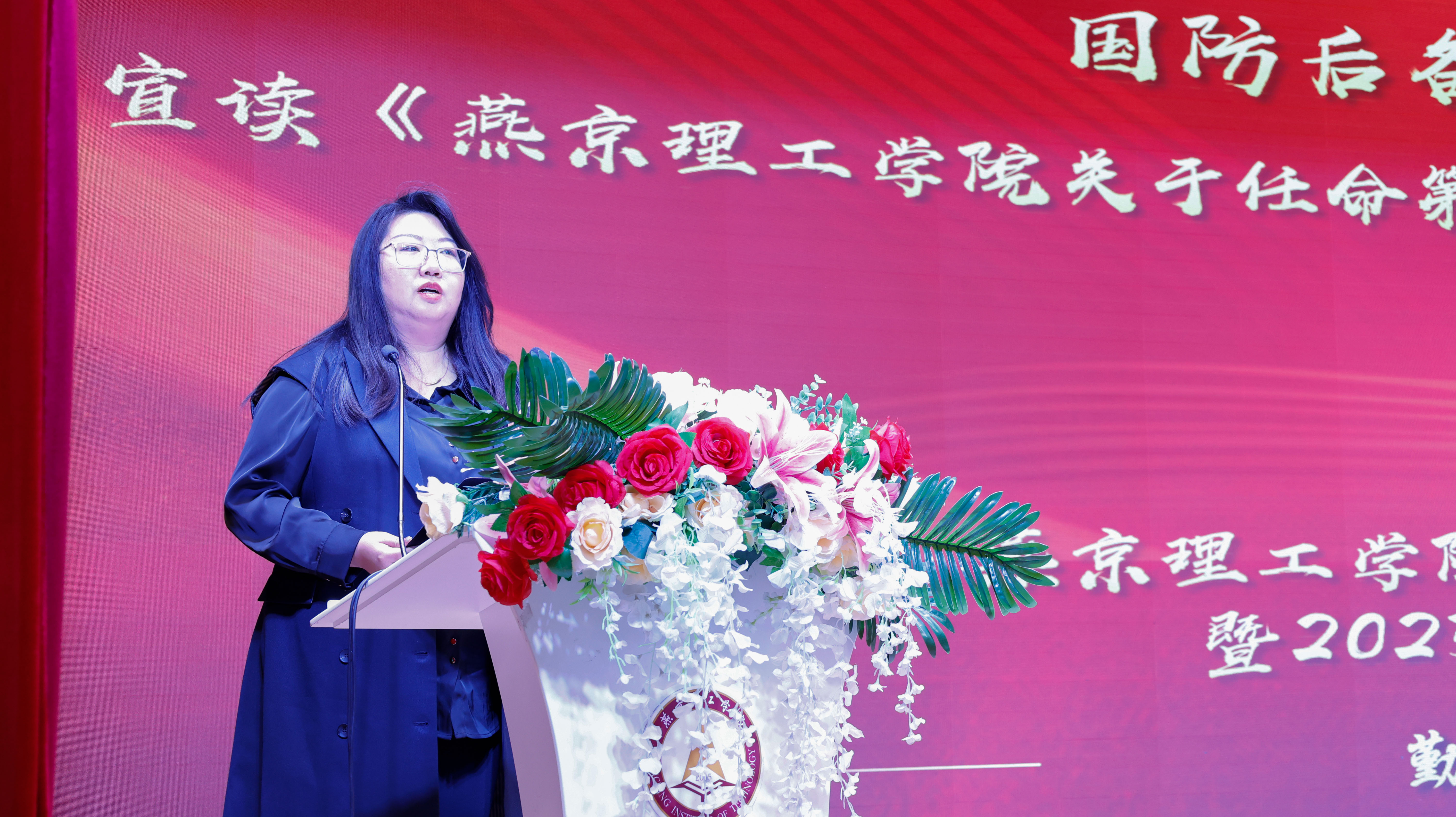 杨文静老师宣读《燕京理工学院关于任命第二届国防后备营学生干部任职名单的决定》并颁发工作证,国防后备营全体成员宣誓,优秀退伍士兵发表感言。