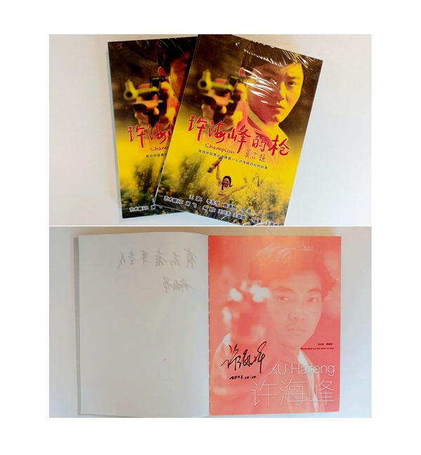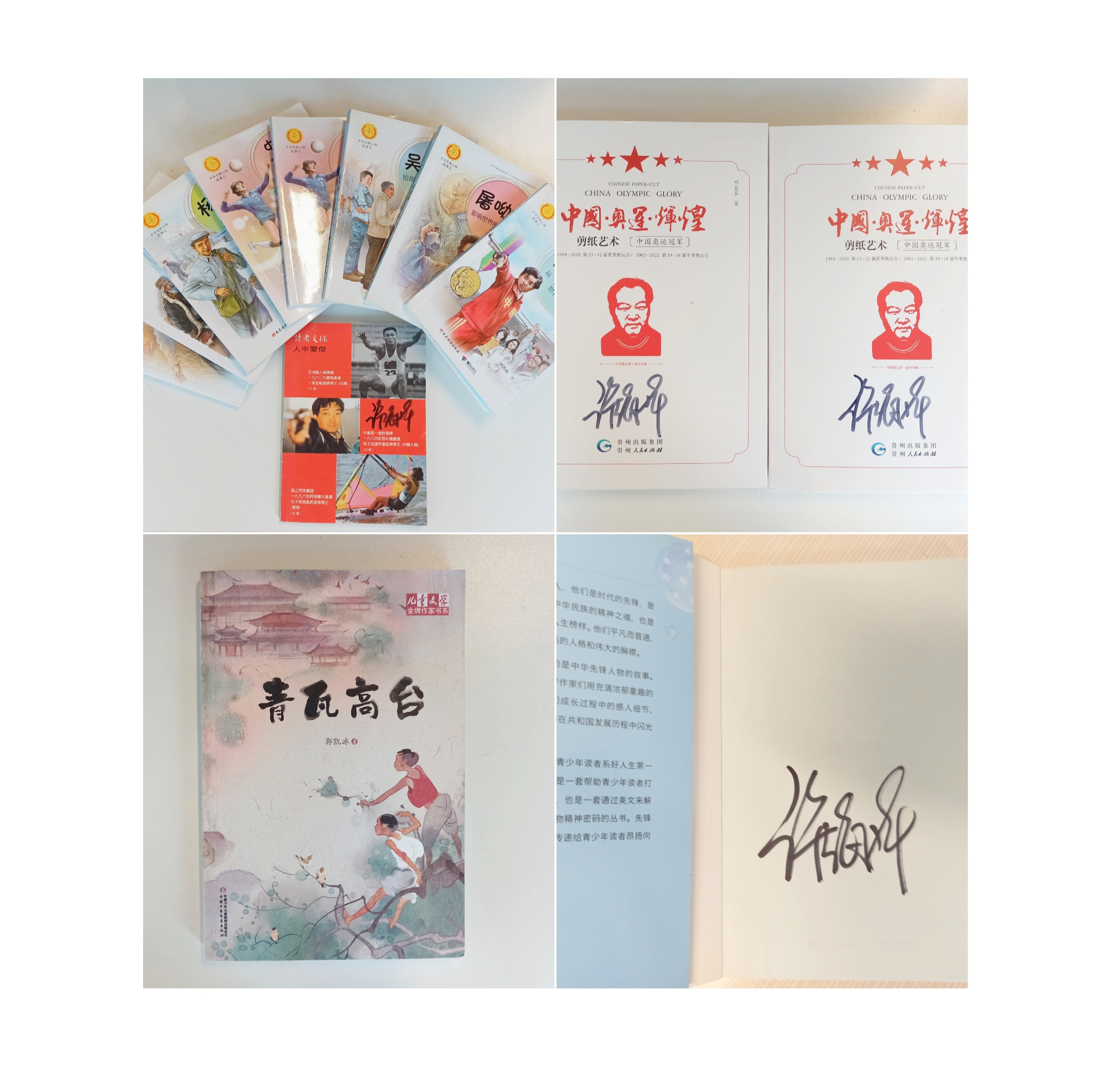 参观完毕,许海峰先生向图书馆赠送了《中国·奥运·辉煌——剪纸艺术》《许海峰的枪》《读者文摘》《中国先锋人物》《青瓦高台》等图书并签名留念。张萍主任代表图书馆接受赠书,并表达了感谢。