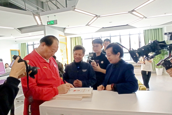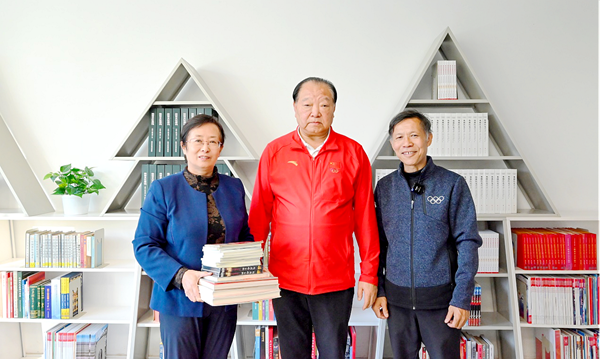 张萍主任介绍了图书馆的整体情况,与刘超英顾问一同讲解了“超英奥运图书坊”。图书坊旨在收录珍贵的奥运故事和奥运场景,让读者了解我国百年奥运史的辉煌,以及为奥林匹克理想付出的艰辛努力,许海峰先生对于奥运图书坊的设立给予了高度肯定和赞扬。