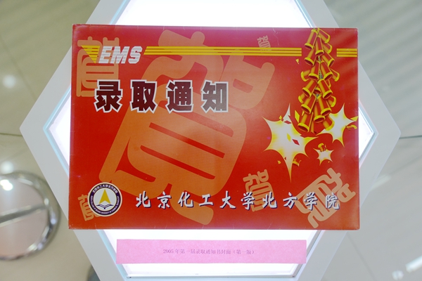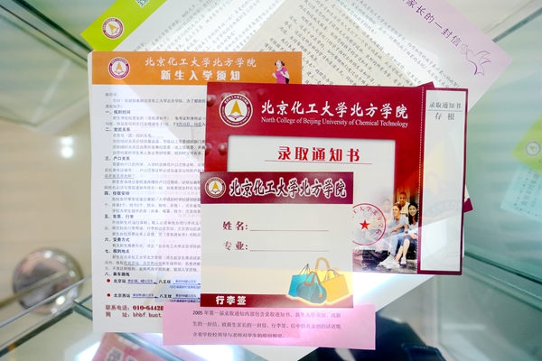 燕京理工学院2005年建校,其前身是中国优秀独立学院——北京化工大学北方学院,2013年经教育部批准转设为燕京理工学院。因此,“第一封录取通知书”封面印有“北京化工大学北方学院”的校名,并印有校徽。经过录取通知书色系的演变,逐渐为“燕理红”奠定基础。“录取通知书”“入学须知”“致学生家长的一封信”“行李签”等“第一封录取通知书”从学校出发,迎接来自祖国各地的莘莘学子。