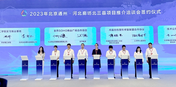 本网讯(艺术学院 邵雷)为加快建设北京市通州区与北三县一体化高质量发展示范区,9月19日,北京通州——河北廊坊北三县项目推介洽谈会在廊坊市大厂回族自治县举办。燕京理工学院艺术学院院长沈宏与数字媒体艺术专业课程群负责人一同参加了本次会议。会上,北京市与廊坊北三县现场签约项目高达50项,意向投资额约426.81亿元,涉及产业、公共服务、交通基础设施、现代服务业等重点领域,其中,我校"燕京理工学院实习就业基地"项目成为签约仪式的焦点之一。