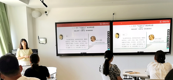 为发挥老教师“传帮带”作用,马克思主义学院骨干教师刘旺华老师围绕《思想道德与法治》第一章第一节中的知识点“树立高尚人生目的”开展了一堂示范课。刘旺华老师以提出问题、解决问题为教学线索,通过理论剖析和案例分析相结合的方式,借助智慧教室开展线上线下混合式教学,深入浅出地讲解了大学生应如何回答好自己的“人生三问”:我是谁?我从哪里来?我到哪里去?为教师们尤其是新入职老师提供了独到的备课视角和丰富的备课素材,增强了全体教师上好开学第一课的底气和信心。