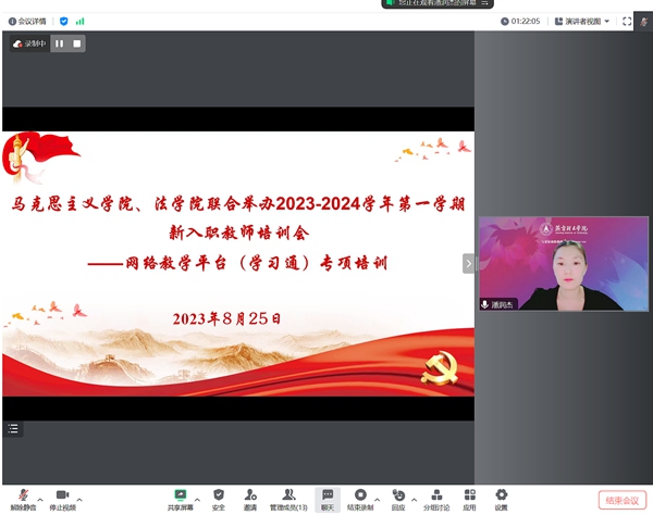 为确保新入职教师高效率、高质量开展新学期教学工作,由《习近平新时代中国特色社会主义思想概论》课程任课教师潘润杰对马克思主义学院和法学院全体新入职教师进行了学习通专项培训,通过实际演练带领新教师学习了如何创建一门在线课程,如何管理在线课程,如何利用在线课程开展教学等操作方法,为新学期有效开展线上线下相结合的课堂教学、提升教学质量提供了保障。