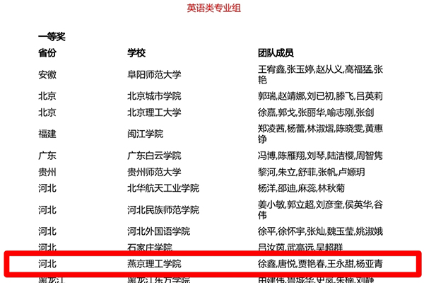 人文教育学院英语类专业组参赛教师:徐鑫、唐悦、贾艳春、王永甜、杨亚青,团队内部通力合作,深挖教材内容,利用学校智慧教室优质资源,探索数字赋能,创新教学设计,取得了全国复赛英语类专业组一等奖的佳绩。