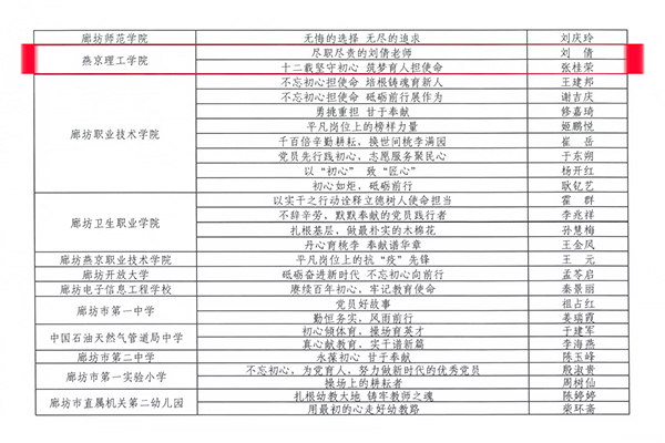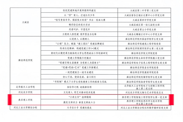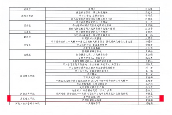 本网讯(党委办公室 张雨 王彦硕)近日,河北省廊坊市委教育工委发布了“党员好故事、书记好党课、支部好案例”评选结果,我校马克思主义学院教工第三党支部书记刘倩老师“尽职尽责的刘倩老师”、人文教育学院党总支组织委员张桂荣老师“十二载坚守初心,筑梦育人担使命”入选市级“党员好故事”获奖名单,马克思主义学院党总支书记赵见伟老师“走进中国式现代化”、马克思主义学院教工第一党支部书记黄春梅老师“思想闪耀行动指南”入选市级“书记好党课”获奖名单,智能工程学院学生第一党支部“‘小班主任’挂职锻炼”、信息科学与技术学院学生第三党支部“激发支部活力,彰显支部战斗力”入选市级“支部好案例”获奖名单。