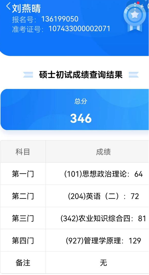 李淑薪想要不断丰富自己的专业知识,所以很早就确立了想要考研的目标。刚开始选择考研院校和专业时,李淑薪是非常迷茫的,因为不了解每个专业,她就在网上搜了很多资料,咨询了学校老师和学姐学长们,学校老师耐心的为李淑薪分析解惑,最终她决定报考河北农业大学。假期期间,李淑薪给自己计划了每天需要完成的任务,并且严格执行。回到学校,她每天六点起床,早早去图书馆学习,晚上十点回宿舍,“虽然日复一日很枯燥,但是有小伙伴的陪伴,也很开心的度过了这段时间。”回想起备考的过程,李淑薪总是忆苦思甜。学习累了她就和小伙伴一起去吃好吃的,学校的螺蛳粉和鱼粉成了李淑薪经常光临的地点。晚上吃完饭李淑薪就去图书馆周围遛遛弯,然后继续学习,吃饱喝足之后连学习都变得轻松起来,这也许也是一种最佳的放松方式。初试和复试如期到来,李淑薪在心里默默告诉自己,不管结果怎么样,只要倾尽全力就够了。“我一直认为我们有足够的勇气和坚持走完这趟考研之旅已经非常厉害了。”不畏结果,无憾于往,但愿这一历程中已炼就更好的自己。