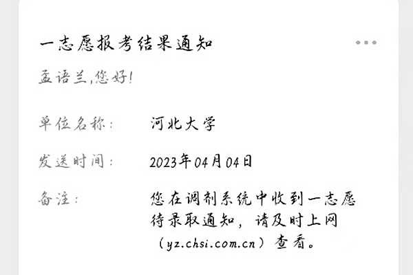 孟语兰在2022年的3月底就基本了解了考研流程,并投身复习之中。即便有学长学姐提醒孟语兰河北大学的报考难度,她还是坚定自己的目标,“只有我才最了解我自己。”孟语兰说道。考研对于孟语兰来说是多出来三年的时间探索生活更多的未知可能。孟语兰认为既然选择了走哪条路,就坚定的走下去,摇摆不定的心态才最击垮一个人。“坚定选择其实是最难的,因为人总是更羡慕别人的,会幻想将自己的形象代入。我不否认有人可以一心好多用,各个赛道都能做到很好。但是对我来说,一心一意做好眼前事,何尝不是成功呢。”孟语兰把人生看作是一场未知的征途,不到最后一刻就没有所谓的终点。她建议学弟学妹们,要在该学的时候认真学,该玩的时候放开玩,要做到自己心里有数。并且勇敢去尝试新鲜事物,要重视过程,而非结果。尽自己最大的努力,坚信你走过的每一步路都算数。