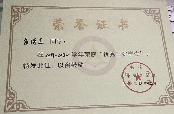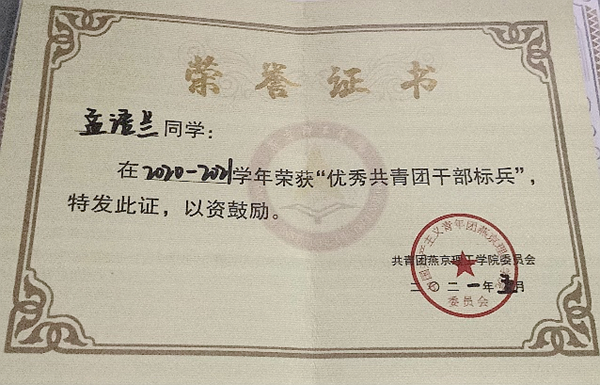 孟语兰是国际商学院19级财务管理专业的学生,她成功升入河北大学人口学专业的硕士研究生。在校期间,孟语兰成功考取初级会计职称技能证书和普通话一乙的证书,并荣获优秀三好学生、优秀共青团员、优秀共青团干部标兵、学校15周年校庆活动优秀个人等荣誉称号。