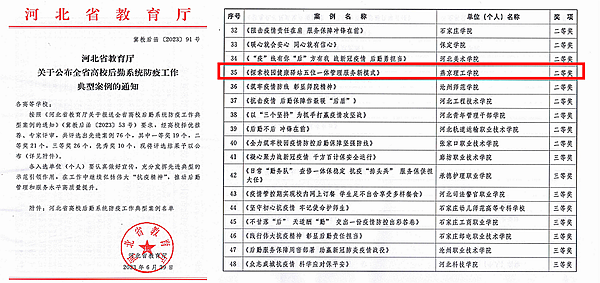 本网讯(后勤资产处 付嘉琪)近日,河北省教育厅公布了全省高校后勤系统防疫工作典型案例评选结果,我校报送的《探索校园健康驿站五位一体管理服务新模式》荣获二等奖。