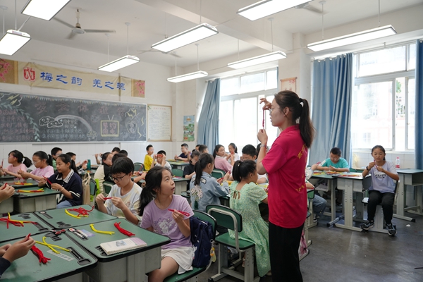 “老师,你看我写得对不对,这幅画的配色好不好?”“用彩纸剪出的小兔子真是活灵活现”“原来汉字还有这么多讲究……”一声声呼唤让承担剪纸、书法课教学任务的阴嘉诚应接不暇。“来这之前,我和其他实践队员认真调研了平通羌族乡中心小学的课程设置,通过综合考量,在支教中增加了手工、书法、国画、剪纸、声乐等兴趣课程,不仅弘扬了中华优秀传统文化,也丰富了整个支教环节的课程内容。”实践队员各展所长,揉捏剪搓粘,妙手生花体验手工乐趣。皴擦点染勾,纸墨笔砚感悟国画精髓。书法课上,实践团成员阴嘉诚从汉字历经几千年发展演变的深情讲述,到汉字笔画书写要领的解析,沿着“听、看、学、练、评、改”的教学思路,引导学生感悟中华语言文字的无穷魅力。文化与实践相融,音乐与美术共鸣,优秀文化的传承,艺术之美的展现对平通羌族乡中心小学的孩子们德智体美劳全面发展产生了积极影响。