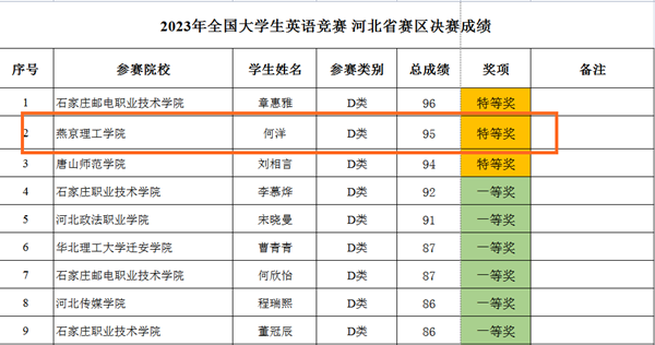 本网讯(文法学院 杨婧)近日,在2023年全国大学生英语竞赛初赛和决赛中,燕京理工学院何洋同学荣获D类特等奖;张静怡、赵栋璇同学获得B类一等奖;金雨蒙、李悦、王嘉钰等七名同学获得C类一等奖;张津源、屈小婷同学获得D类一等奖。