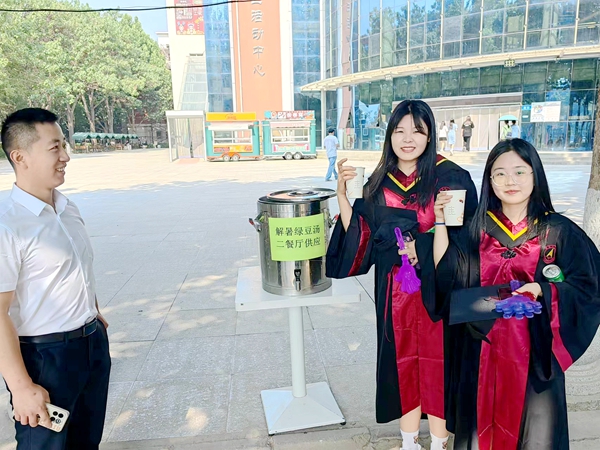 为了毕业生吃上可口卫生的饭菜,吃得舒心,吃得健康,食堂不断加强食品安全管理和工作人员服务质量,调整菜品,增加菜式,满足同学们多样化的味蕾需求。毕业期间,学校各个餐厅开展暖心行动,在餐厅门口免费提供解暑绿豆汤,让大家在炎热的天气里清凉一“夏”。