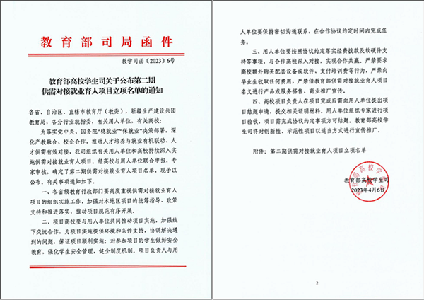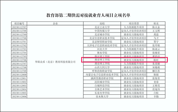 本网讯(艺术学院 陈旺)近日,《教育部高校学生司关于公布第二期供需对接就业育人项目立项名单的通知》(教学司函〔2023〕6号)公布,由艺术学院院长沈宏、艺术与科技陈旺老师共同承担的燕京理工学院艺术学院艺术与科技专业和华娱众禾(北京)教育科技有限公司合作的“就业实习基地项目”成功立项。