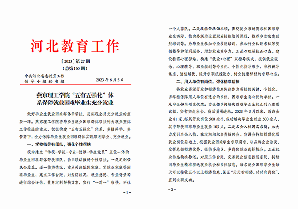 本网讯(就业指导与校企合作中心 李艳杰)6月5日,《河北教育工作》(〔2023〕第27期,总第160期)编发,《燕京理工学院“五有五强化”体系保障就业困难毕业生充分就业》作为促进毕业生高质量就业创业方面的经验做法典型入选刊登。