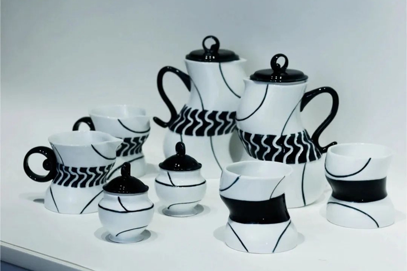 严燕作品《纳西族文化元素咖啡具》将纳西族服饰中的披肩轮廓与现代咖啡具外形相融合,用形体来体现纳西族女性坚韧的性格。其中披星戴月中的小圆盘,沿用刺绣的手法保留图案作为咖啡碟,圆盘中的圆圈分别代表金木水火土,从而来体现着纳西族人民对生活的热爱。