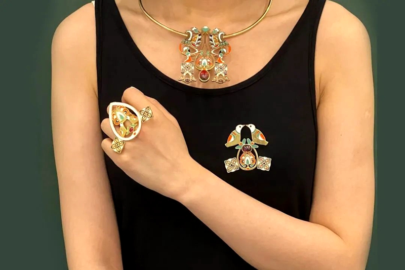 马晨曦作品《绽放之路》系列设计选取代表性的楼兰古城文化元素的盘雕锦纹,通过对西域锦纹元素的研究和分析来进行创新再设计,让首饰设计更加具有多元性和艺术性,满足当代人的审美需求,穿越历史与时代,将美再次展现。