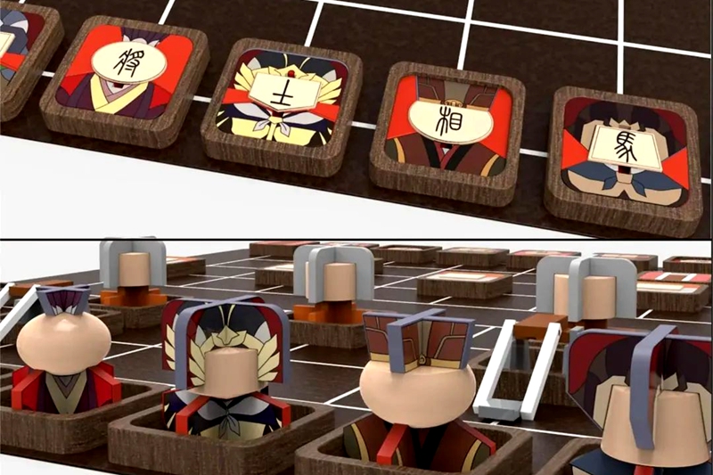 刘子卓作品《儿童象棋设计》利用传统文化与素质教育的价值让象棋与中国传统文化相结合,棋子分为平面造型和立体造型,造型融入了三国故事,将三国时期的人物分别与棋子相对应,为每一个棋子赋予身份,为棋子设计形象。造型上利用七巧板和榫卯进行结合实现平面和立体的转换,实现了零部件自由拆分组合,方便用完后直接回收。