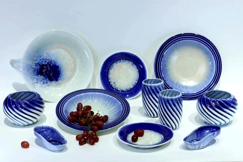 曲格平作品《鲸落文化餐具窑变》将“鲸落”文化与“窑变”工艺相结合,凭借其入窑出窑万彩的神奇窑变和变化无穷的图形色彩和奇妙韵味,突破了传统的单一色釉,亮光釉面细腻光滑,色彩斑斓;釉色深浅不同,每一个都有它不同的纹路和斑点,每个产品都是特别的存在。