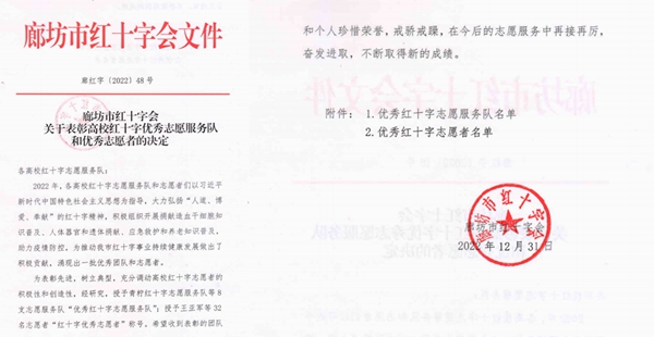 廊坊市红十字会红头文件中燕京理工学院组织及师生获荣誉称号