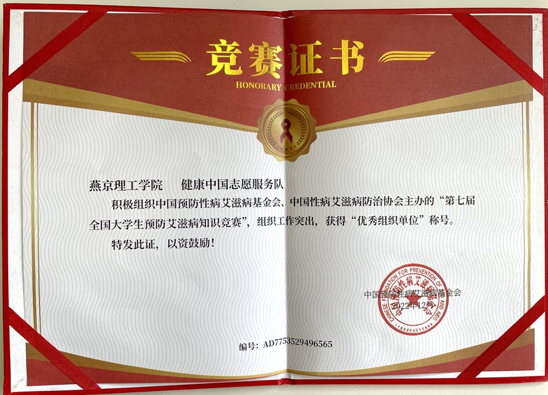 燕京理工学院健康中国志愿服务队“优秀组织单位”证书