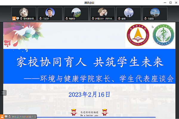本网讯(环境与健康学院 陶薪羽)2月16日,环境与健康学院于腾讯会议线上召开家校协同育人·共筑学生未来座谈会。国际教育学院吴仲元院长、环境与健康学院院长马登军、党总支书记门纪宇、全体辅导员老师及学院部分优秀学子和学生家长参加了此次线上座谈会。