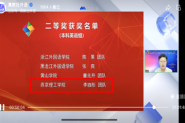 本网讯(文法学院 李珈彤)11月5日,由高等教育出版社、全国高校教师网络培训中心与《中国外语》编辑部共同组织的“2022年外语微课优秀作品全国交流活动”成功举办,持续8个月的“2022年外语微课优秀作品征集与交流活动”圆满落幕。文法学院李珈彤团队(团队成员:李雅婷、李春晓、毕富利、张悦)荣获全国赛二等奖,实现了学校在国家级教师微课大赛奖项上的历史性突破。