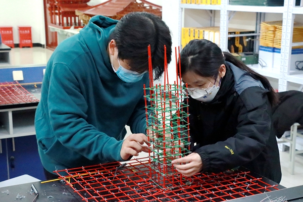 在钢筋平法理论基础应用比赛中,十二组参赛选手进行线上答题。在钢筋平法施工应用竞赛中,参赛成员以答题计算出的数据为依据来进行钢筋的捆扎。同学们先根据前期计算出的数据对钢筋的间距做了标记,随后进行了钢筋网片及柱的基础插筋和箍筋的绑扎。两部分都完成后,将其组合在一起完成作品。比赛结束后,老师们对各个小组的作品进行评分,而后合影留念。