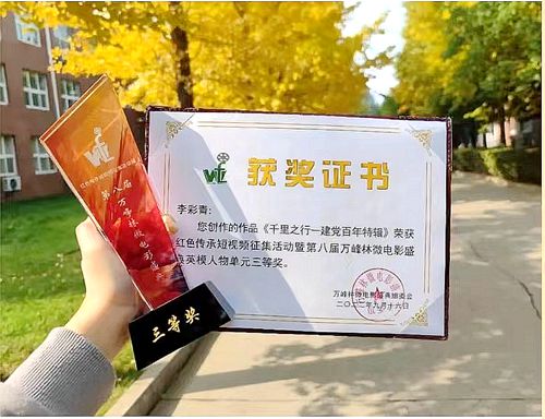 本网讯(传媒学院 毕璟璇)我校传媒学院播音2104班李彩青创作的《千里之行——建党百年特辑之红色传承》在“第八届万峰林国际微电影盛典”中获得英模类人物单元三等奖佳绩。该作品是以红色为主题的短视频,由李彩青同学本人出镜并朗诵。