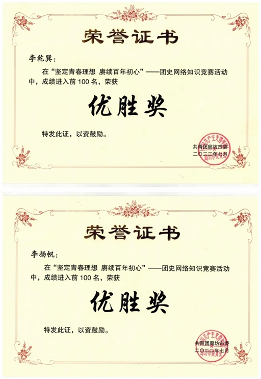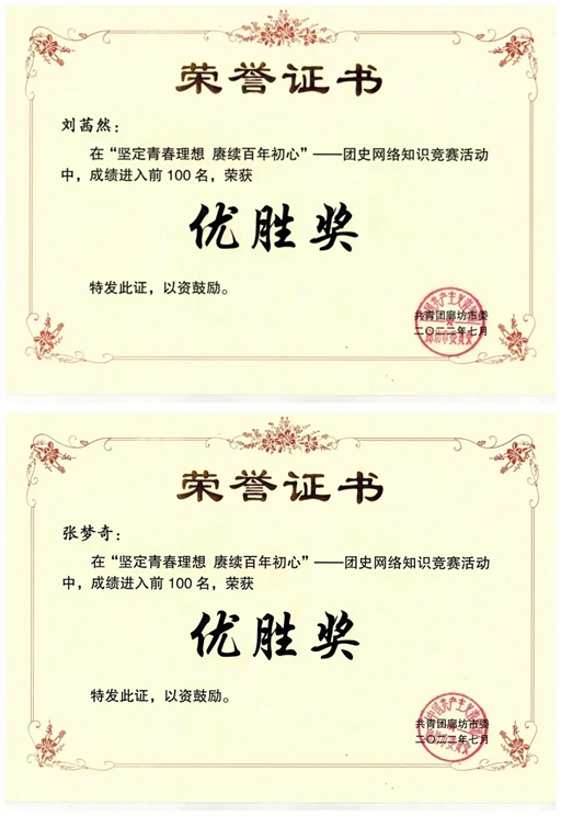 四名同学在共青团廊坊市委团史网络知识竞赛中跻身前百