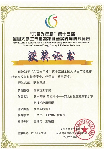 本网讯(学生处 高亚丹)近日获悉,由王伟冉、王艳霞指导,王举昂、王欣雨、曹佳悦参加的社会实践调查类作品《肥水双节节能减排——河北省设施蔬菜节水节肥技术应用研究》项目在2022年“六百光年杯”第十五届全国大学生节能减排社会实践与科技竞赛中荣获三等奖;李延辉、曹安浩、曹元成参加的《河北省内外企业节能减排问题与对策的比较研究》和蒋雯娟参加的《关于高校学生生活垃圾分类意识和行动的意识》2件作品在“河北建投杯”2022年河北省大学生节能减排社会实践与科技竞赛中荣获三等奖。