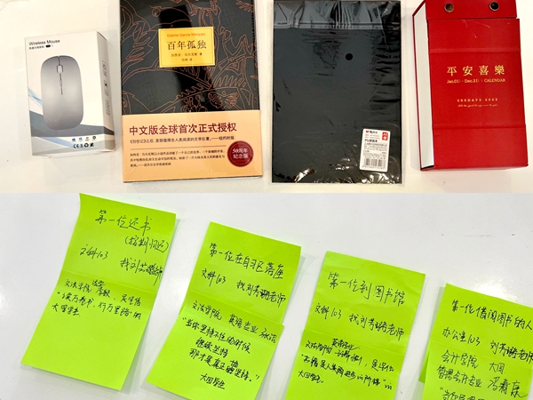 图书馆按照开学准备时发出的开馆首日“四个一”约定,特别准备了系列文创礼物,奖励了第一位到馆的学生王瑞愉,第一位在自习室落座的学生张洁,第一位借阅图书的学生冯清康,第一位按期归还图书的学生李颖,鼓励同学们在新学期加倍用功努力学习,借助图书馆更好地助力同学们学业进步。