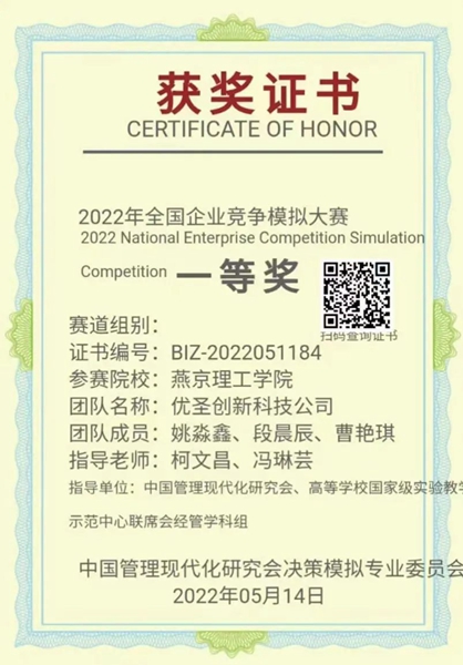 企业竞争模拟大赛旨在通过模拟商战的形式“以赛促学,以赛促练,以赛促改,以赛促建”,落实学校人才培养新模式新方法,使学生在运营实践中树立现代企业经营管理理念,促进管理理论与实践相结合,全面提升学生的管理能力。来自全国29个省市自治区近三百所高校共计2478支队伍报名参赛。因受疫情影响,参赛队伍无法进行线下面对面交流,只能线上讨论决策。比赛中,“优圣创新科技公司”队克服困难,在柯文昌、冯琳芸老师的指导下,利用校内优势资源平台反复模拟练习,制定经营决策,最终获得了一等奖的好成绩。