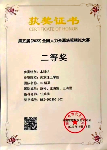 本网讯(国际商学院 柯文昌 冯琳芸 赵格)日前,在由中国管理现代化研究会、全国工商管理专业学位研究生教育指导委员会、高等学校国家级实验教学示范中心联席会经管学科组指导,中国管理现代化研究会决策模拟专业委员会主办的企业竞争模拟大赛全国总决赛上,我校国际商学院姚淼鑫、曹艳琪、段晨辰3名同学组成的“优圣创新科技公司”队荣获企业运营赛道本科组全国一等奖;在由中国管理现代化研究会指导,中国管理现代化研究会决策模拟专业委员会主办的第五届(2022)全国人力资源决策模拟大赛决赛上,人力资源管理专业教师任娟指导的,由梅国际商学院学生赵格、王海雲和会计学院学生王海雯组成的“HR精英”团队荣获全国二等奖。