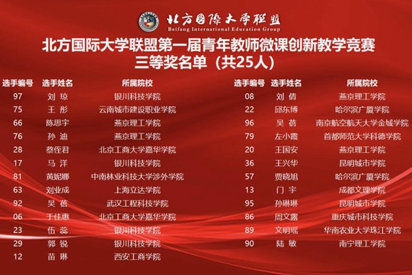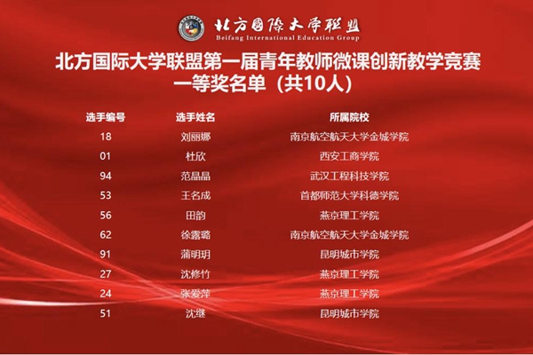 本网讯(教务处 李丽荣)7月3日,由北方国际大学联盟主办、燕京理工学院承办的第一届青年教师微课创新教学竞赛落下帷幕,我校建筑学院田韵、会计学院沈修竹、生命与健康学院张爱萍3名教师荣获一等奖,文法学院陈思宇和孙迪、马克思主义学院刘倩、传媒学院王国安4名教师荣获三等奖,燕京理工学院被评为“优秀组织奖”。