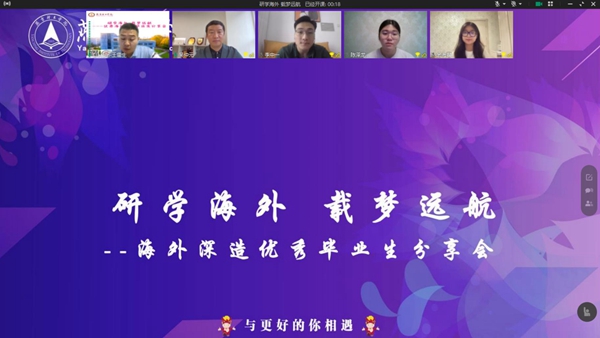 本网讯(国际教育学院 白静)6月22日,由国际教育学院组织的“研学海外 载梦远航”海外深造优秀毕业生分享会线上举办。海外深造国际班的2020届优秀毕业生裴海君和2022届优秀毕业生李中一、陈泽龙从不同方面进行了经验交流。