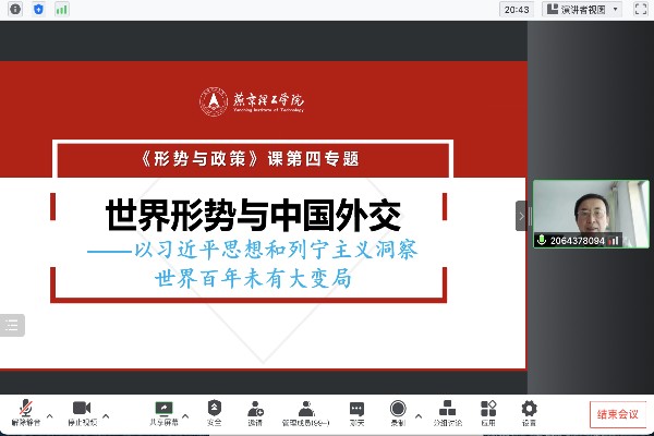 本网讯(马克思主义学院 丁娟 郑小晴 袁宇茜)为了响应习近平总书记提出的“‘大思政课’我们要善用之”的号召,贯彻《教育部关于加强新时代高校“形势与政策”课建设的若干意见》,燕京理工学院马克思主义学院举办“云端”上的大思政课系列活动。6月8日,北京信息科技大学董术副教授开启直播“云课堂”,为2021级财管与金融专业同学讲授了一堂生动的大思政课,主讲《形势与政策》课第四专题《世界形势与中国外交》,副标题:以习近平新时代中国特色社会主义思想和列宁主义洞察世界百年未有大变局。马克思主义学院党总支书记赵见伟及全体马克思主义学院教师共同观摩和交流。马克思主义学院《形势与政策》课程负责人丁娟主持了这堂课。