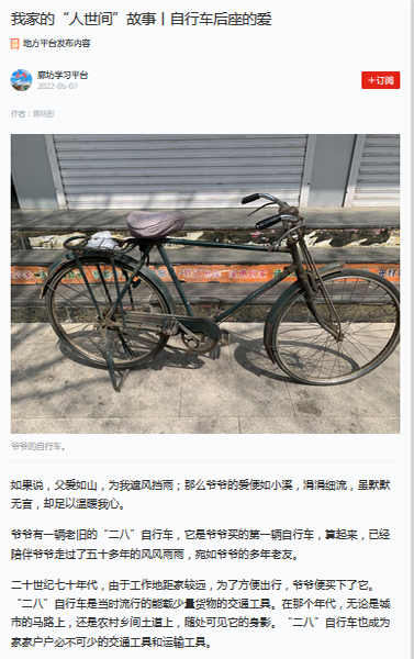 “我家的‘人世间’故事”主题征文表达以家为纽带的相濡以沫的真情,记录在日常生活中留下深刻印象的亲情故事。《我爱我家》《坐上一台“时光机”》《藏在奶奶手帕里的糖果》《自行车后座的爱》《姥姥那双灵巧的手》《“二八大杠”上的童年》等一系列作品反映出普通小家的家风、家训、家教,在历史的回望中唤起人们的时代记忆,激荡起浓浓的家国情怀。